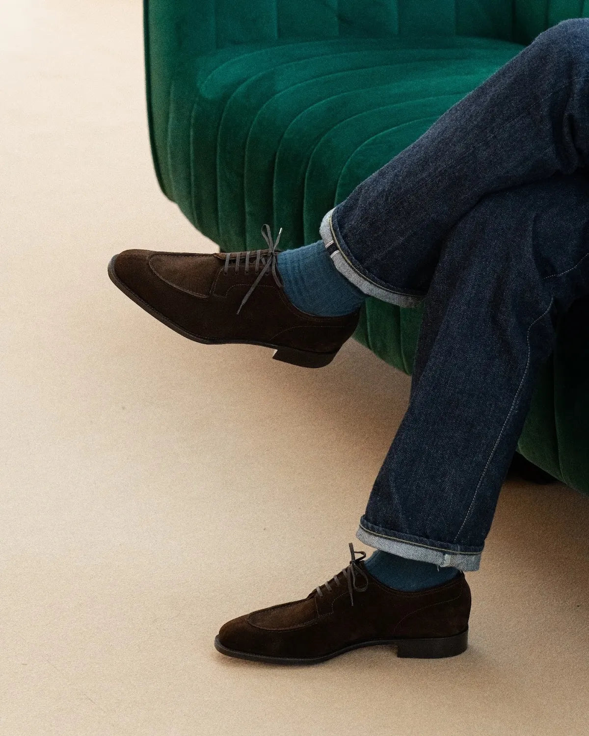 กางเกงยีนส์ HANDROOM กับรองเท้า Edward Green Dover Dark Brown Mink Suede